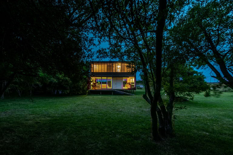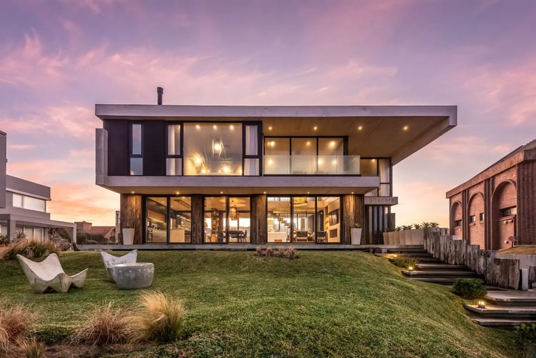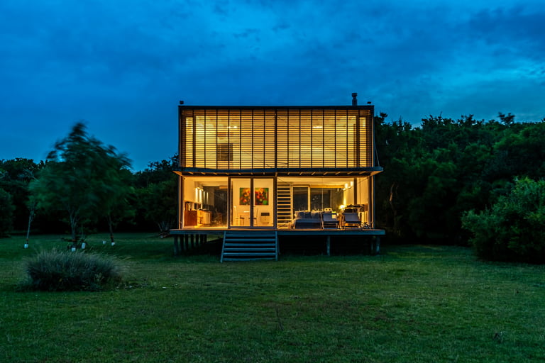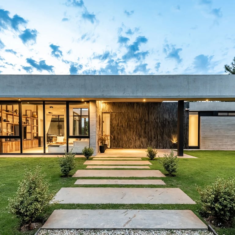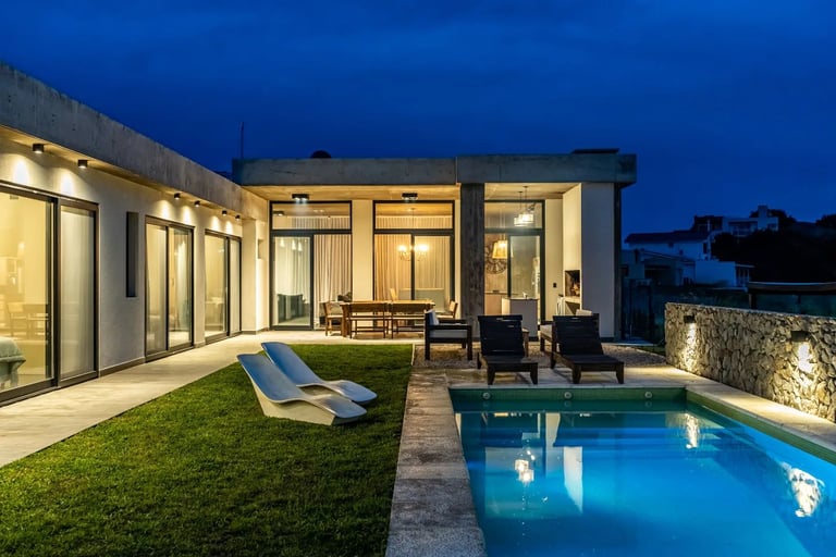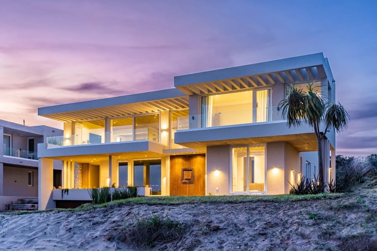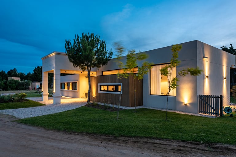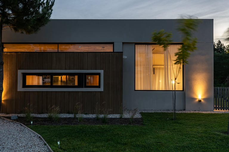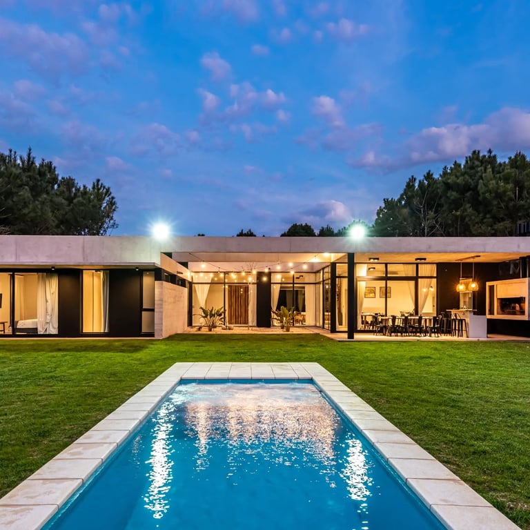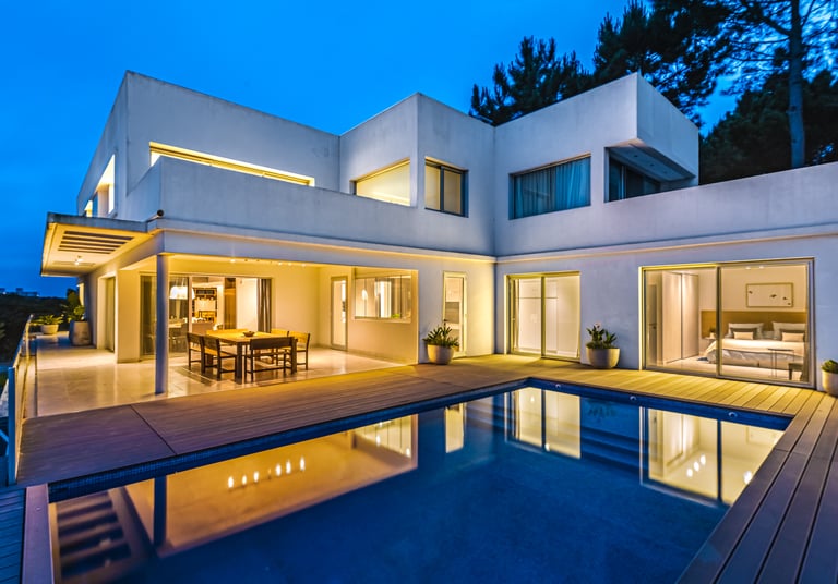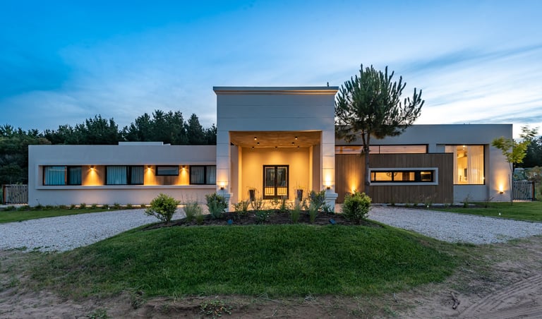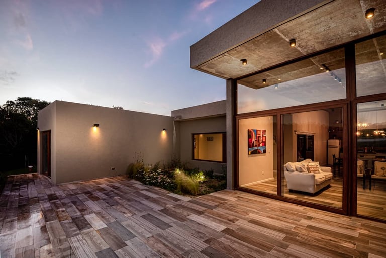 Sesiones al Atardecer: Capturo la transición hacia la hora azul, destacando el diseño de iluminación artificial y creando una atmósfera sofisticada y acogedora.